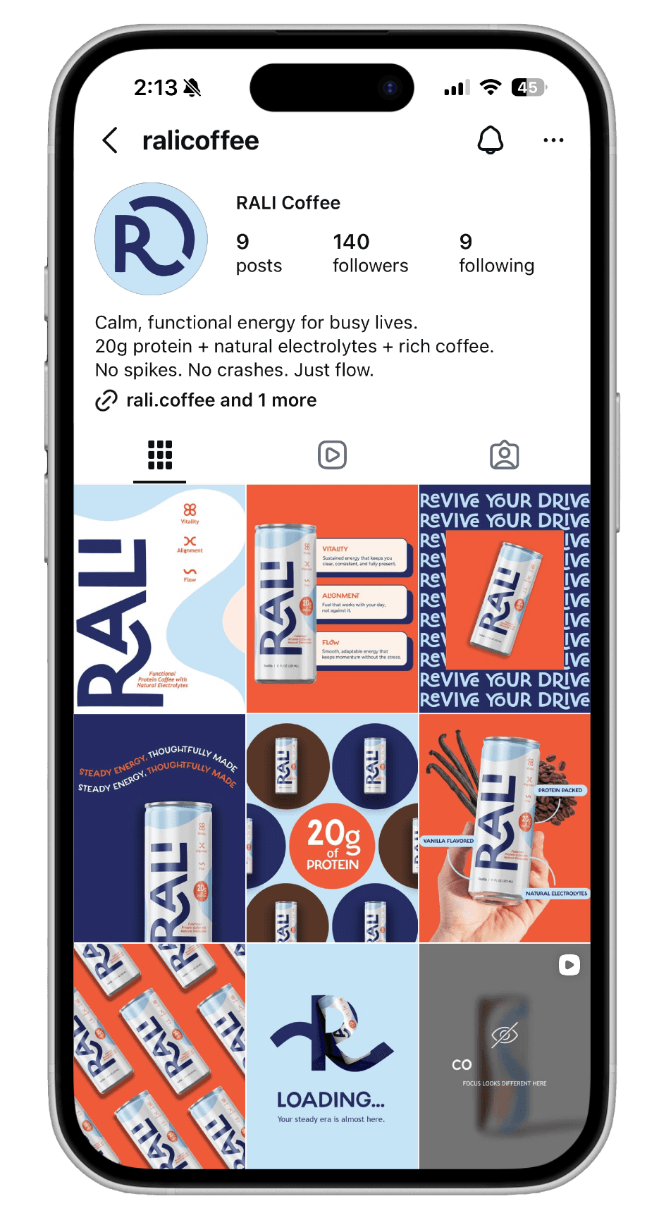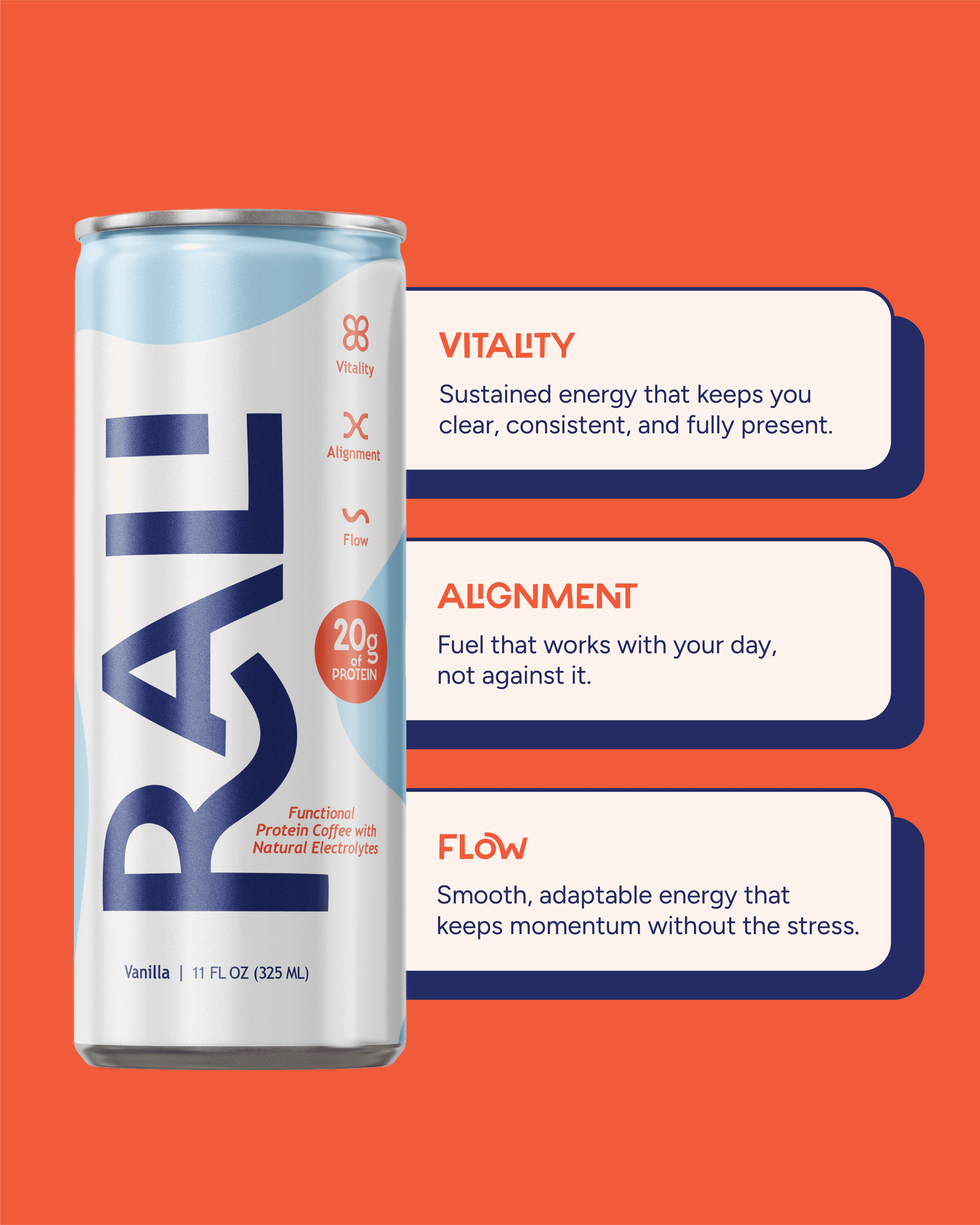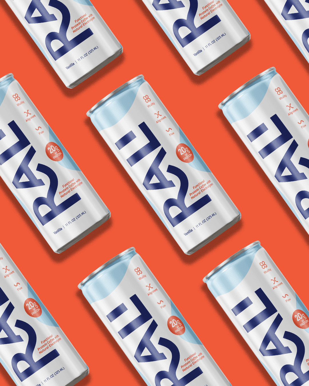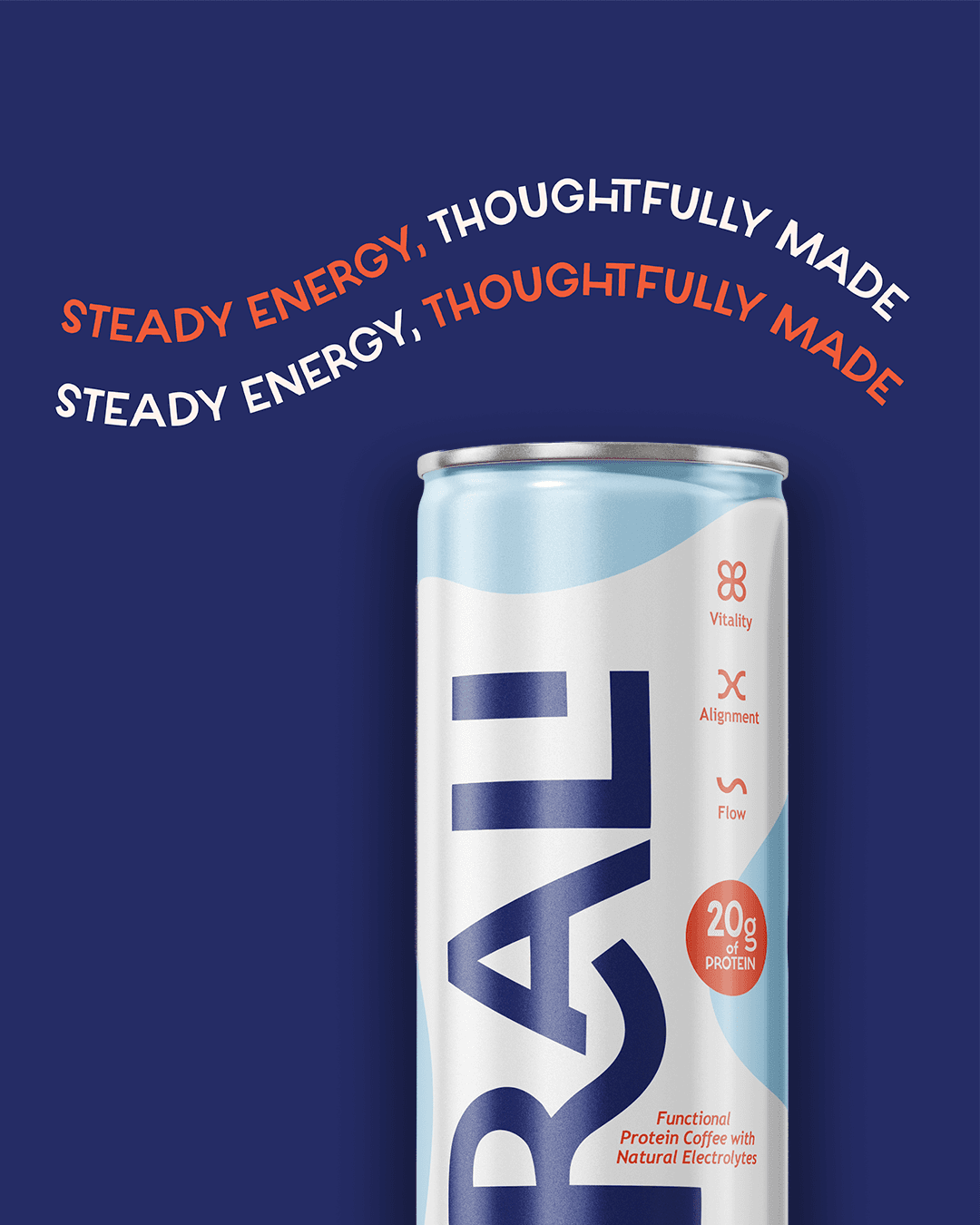 The functional beverage category is saturated and highly competitive. Shelves are dominated by legacy coffee brands and high-stim energy drinks that rely on intensity, masculinity, and exaggerated performance claims. Rali needed to clearly communicate its differentiators, including protein, electrolytes, and coffee-based energy, while avoiding the visual and tonal clichés of the category. Our goal was to establish immediate shelf clarity and position Rali as a credible, modern alternative.