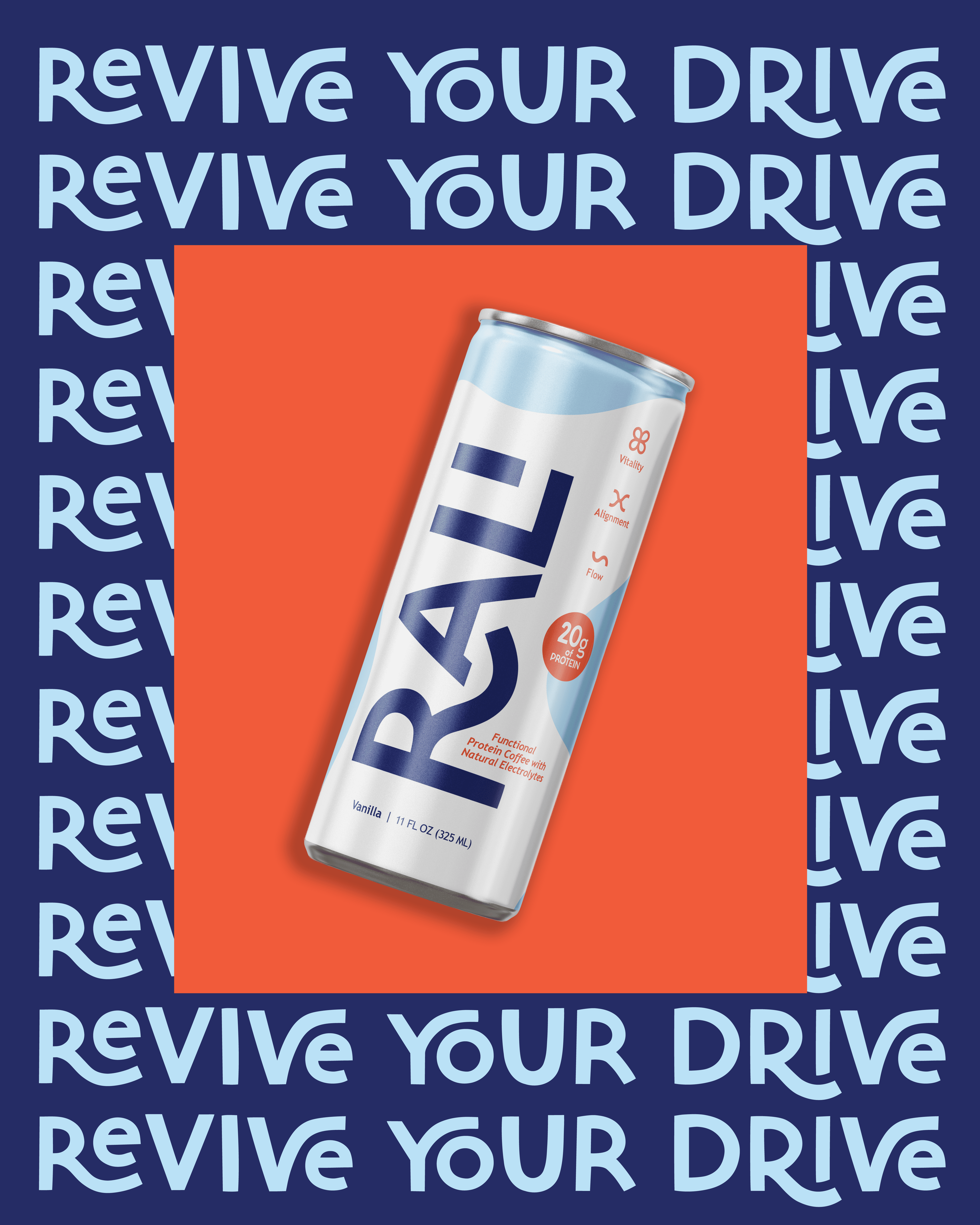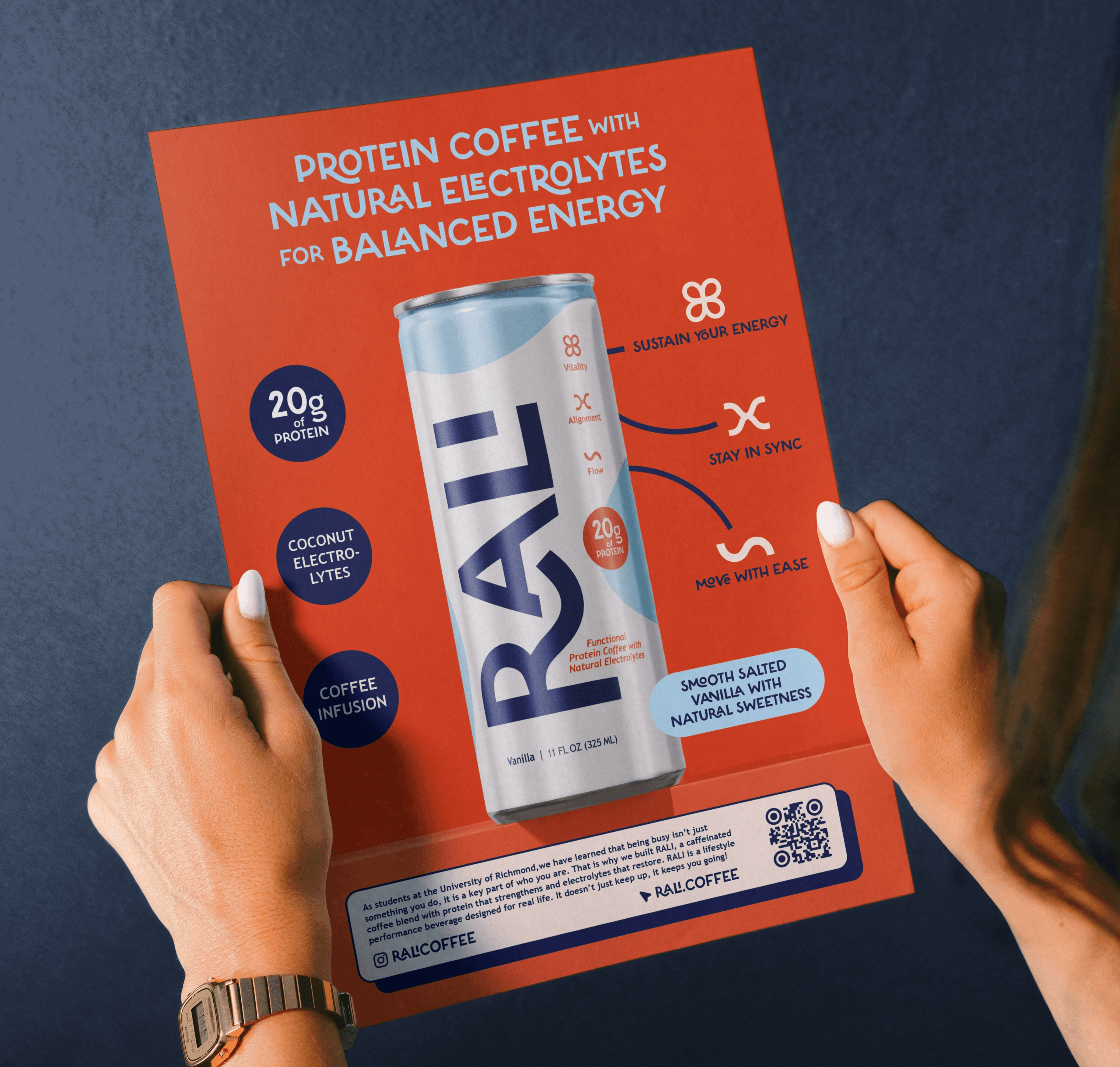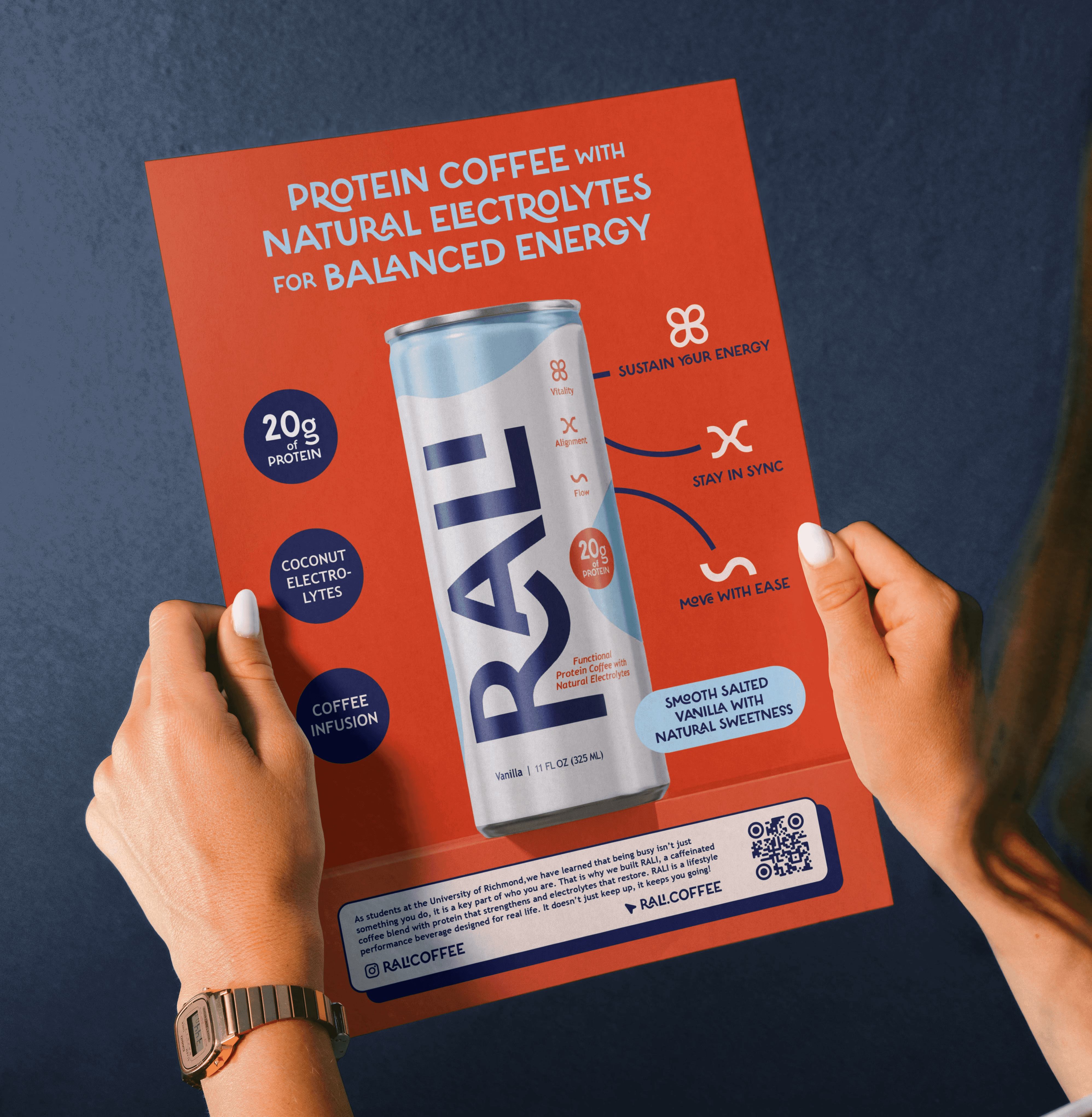 The functional beverage category is saturated with legacy coffee brands and high-stim energy drinks that rely on intensity and hype. Rali offers a smarter alternative by combining protein, electrolytes, and coffee-based energy to support steady, sustained performance. In partnership with the University of Richmond’s Benchtop Innovation Program, our Brandcenter team acted as the creative agency, leading naming, positioning, visual identity, and packaging to bring the product to market.