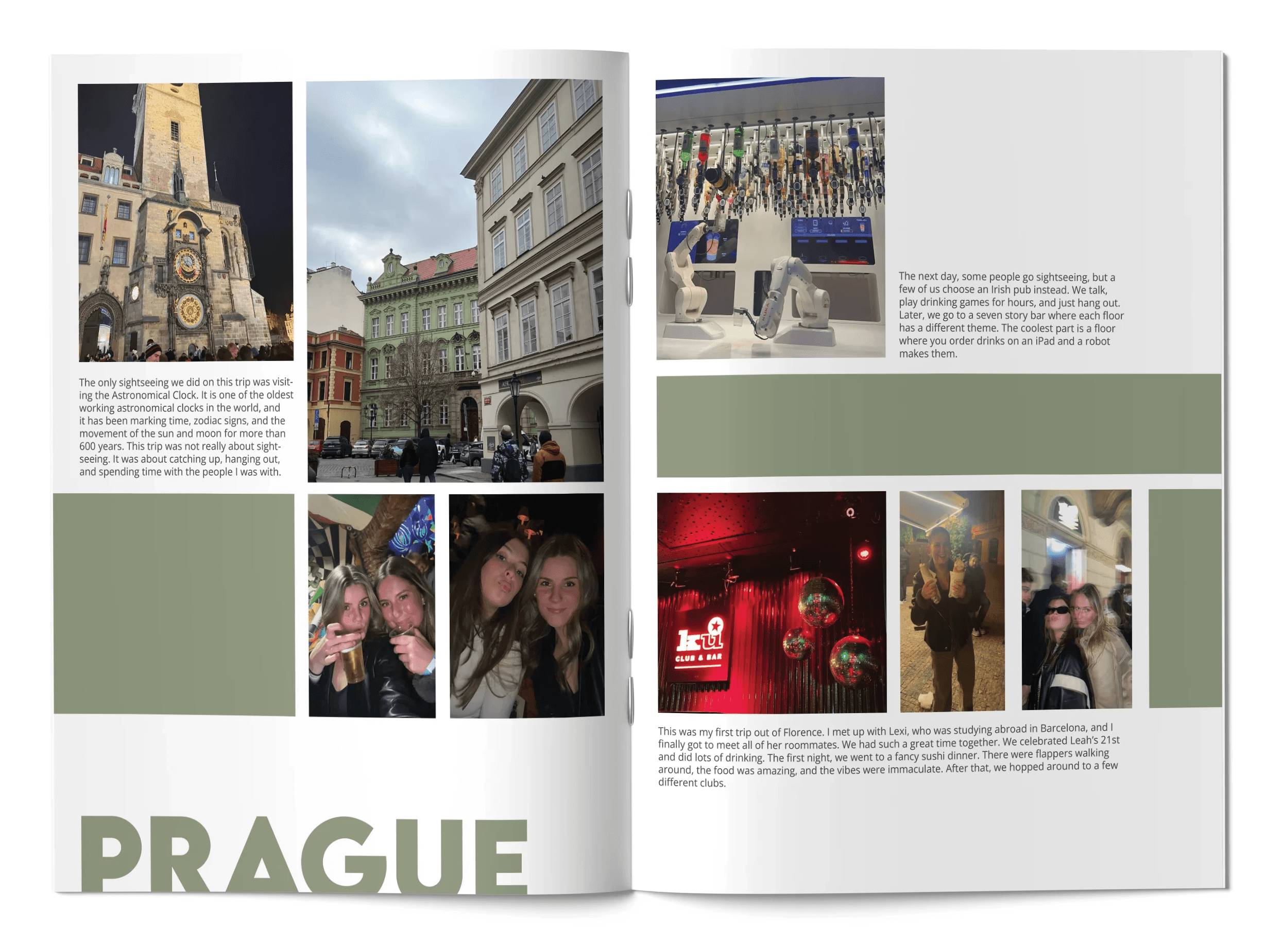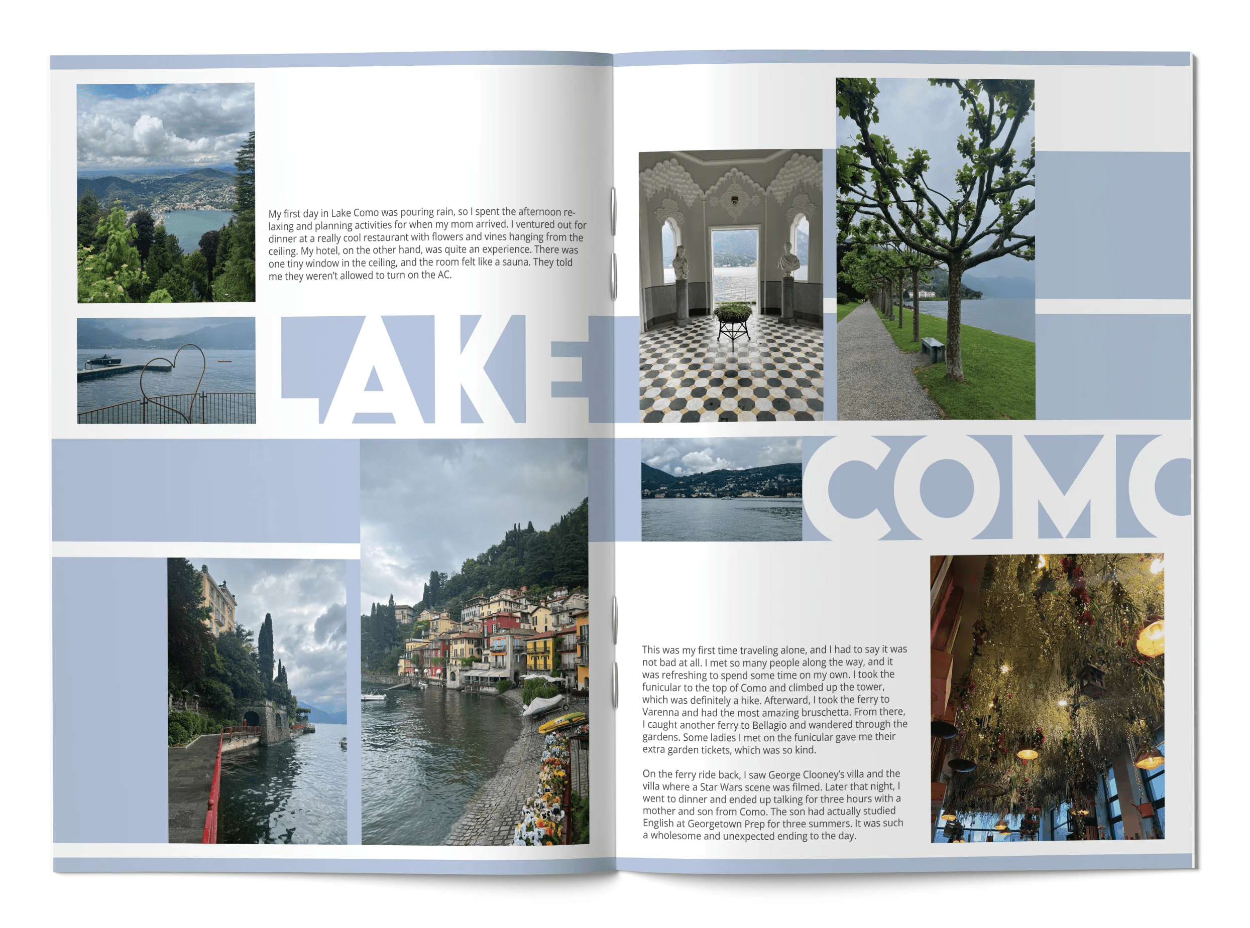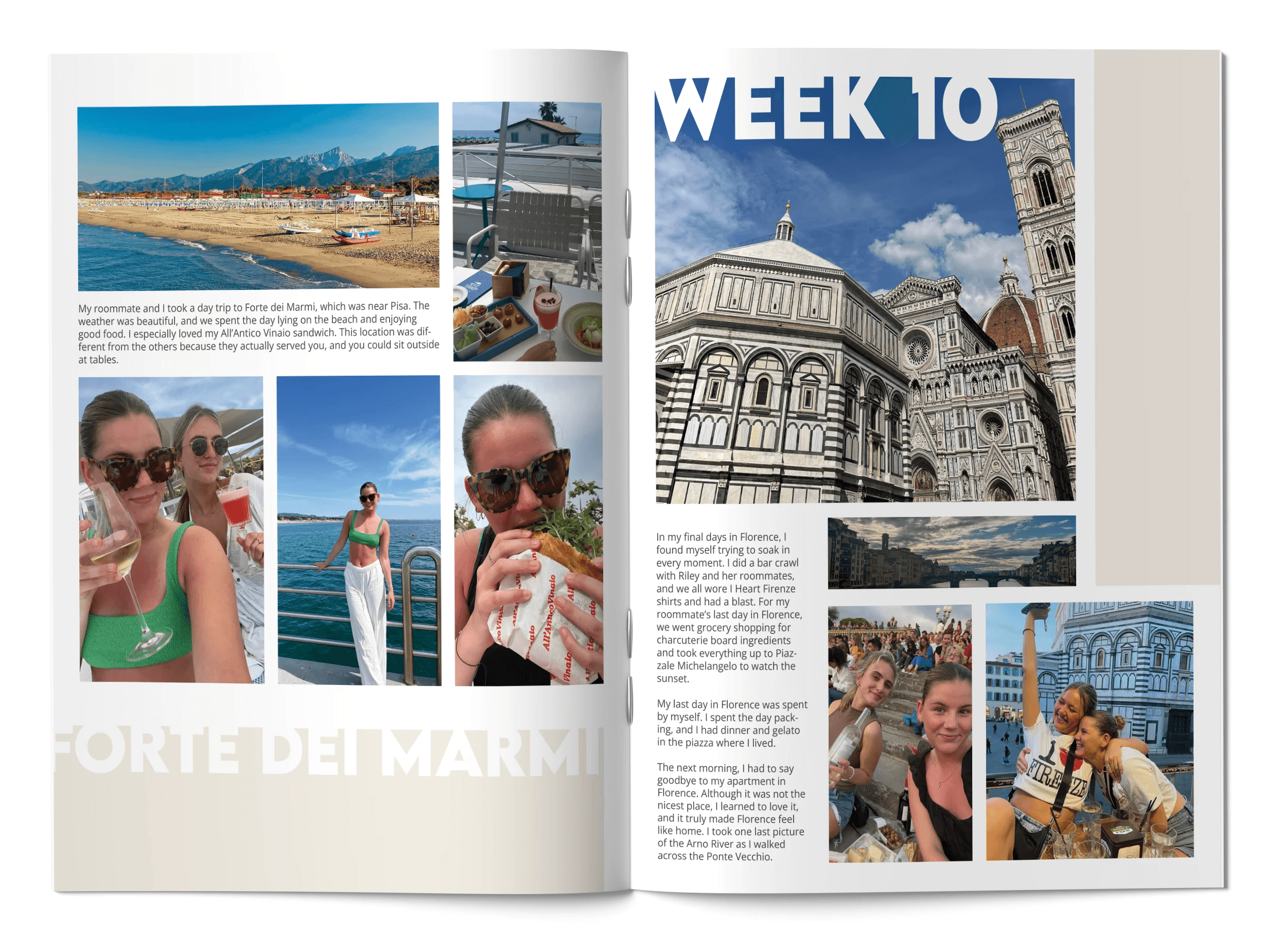 This project took me down memory lane and gave me the opportunity to revisit my time studying abroad in Florence. I had always wanted to turn the photos and moments I documented on Instagram into a physical scrapbook so I could have a tangible record of that experience. The process also served as a great refresher on InDesign, allowing me to experiment with editorial layouts and grid systems while bringing those memories to life in a thoughtfully designed book.