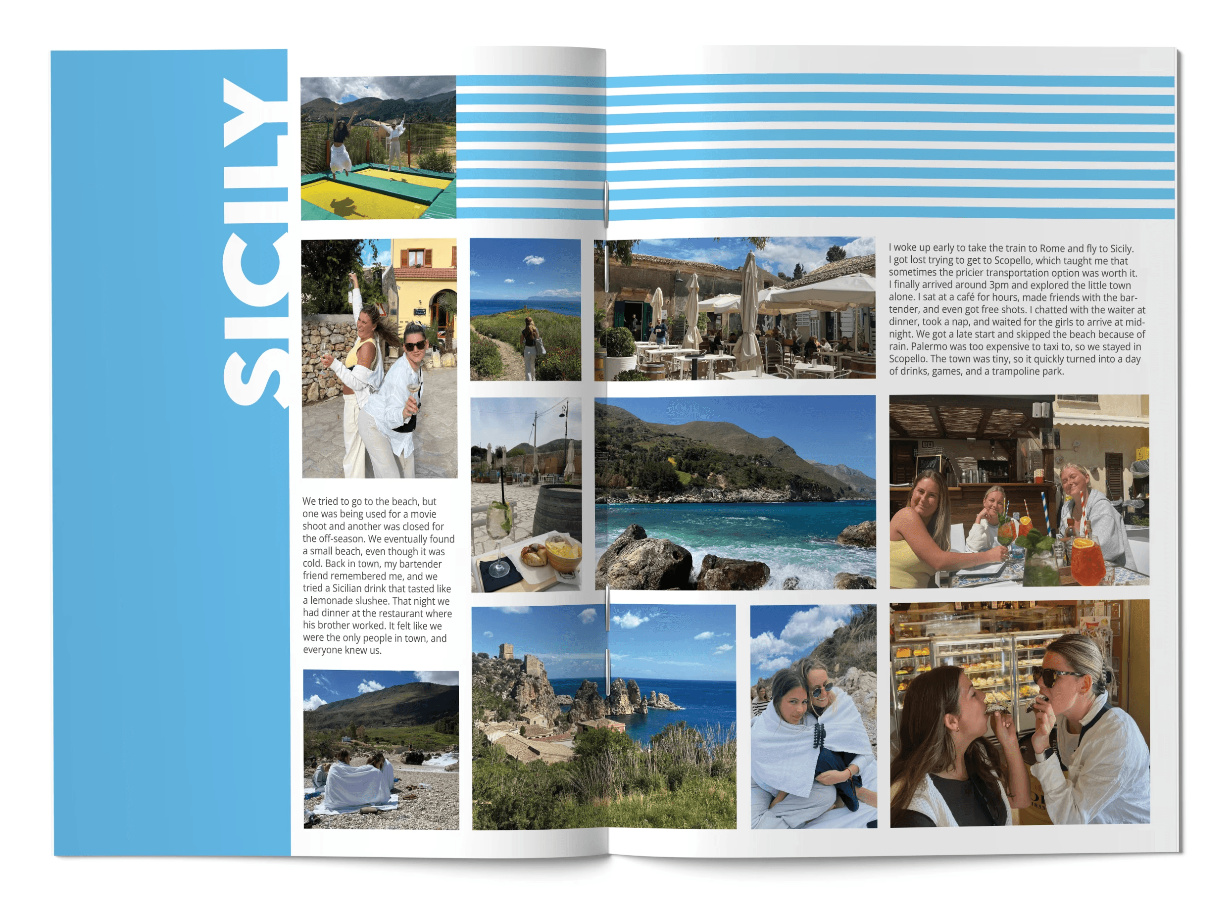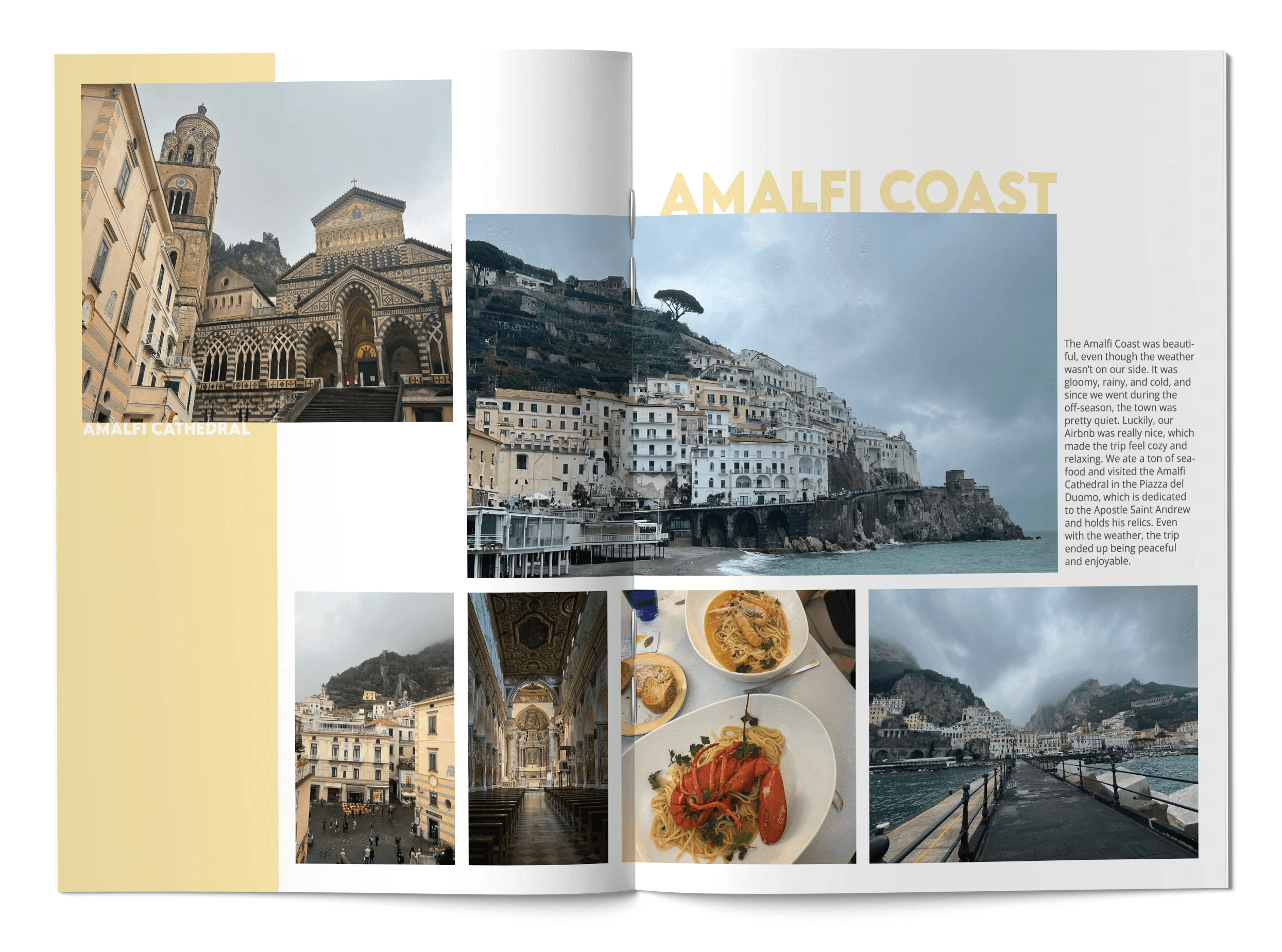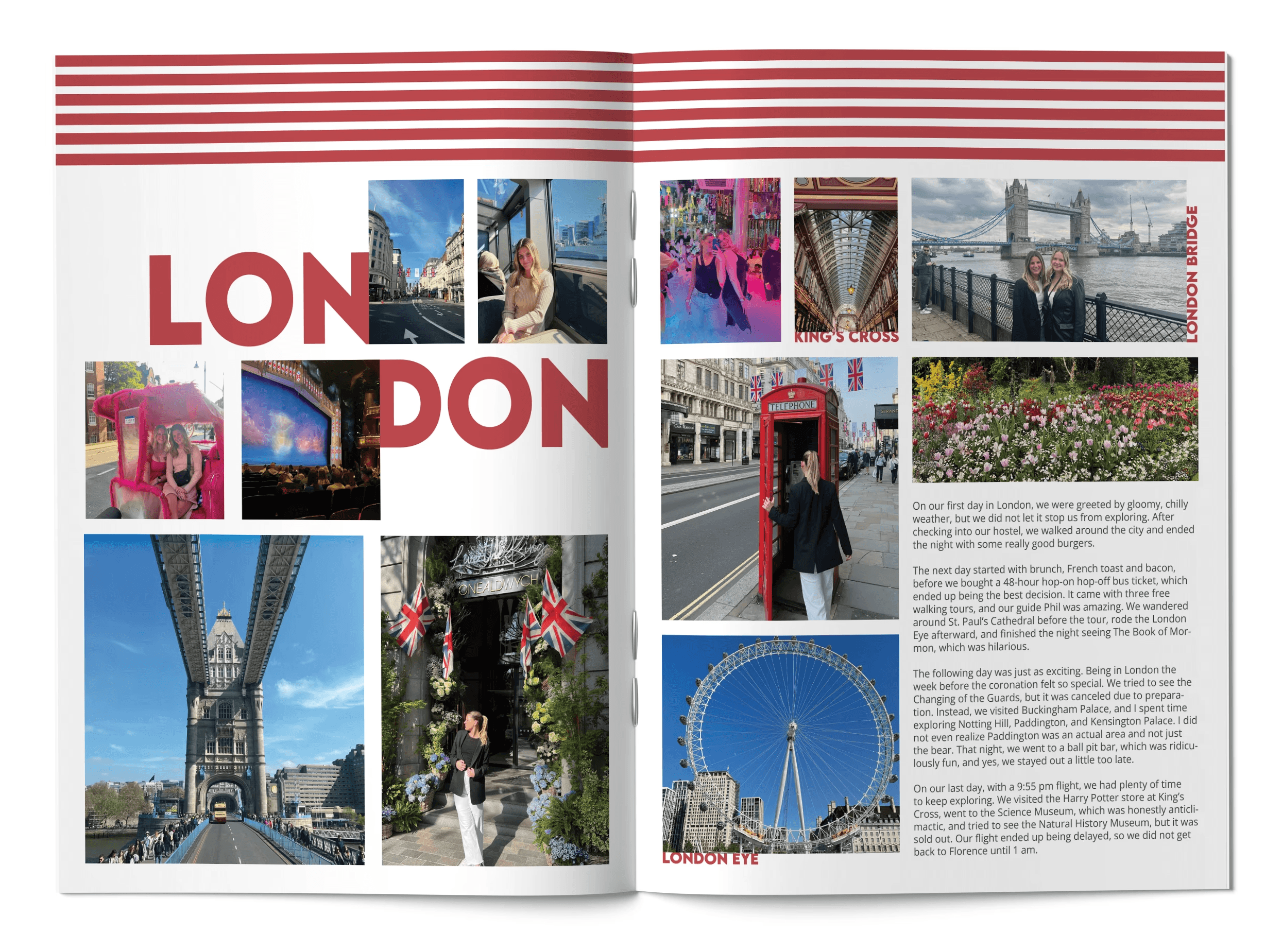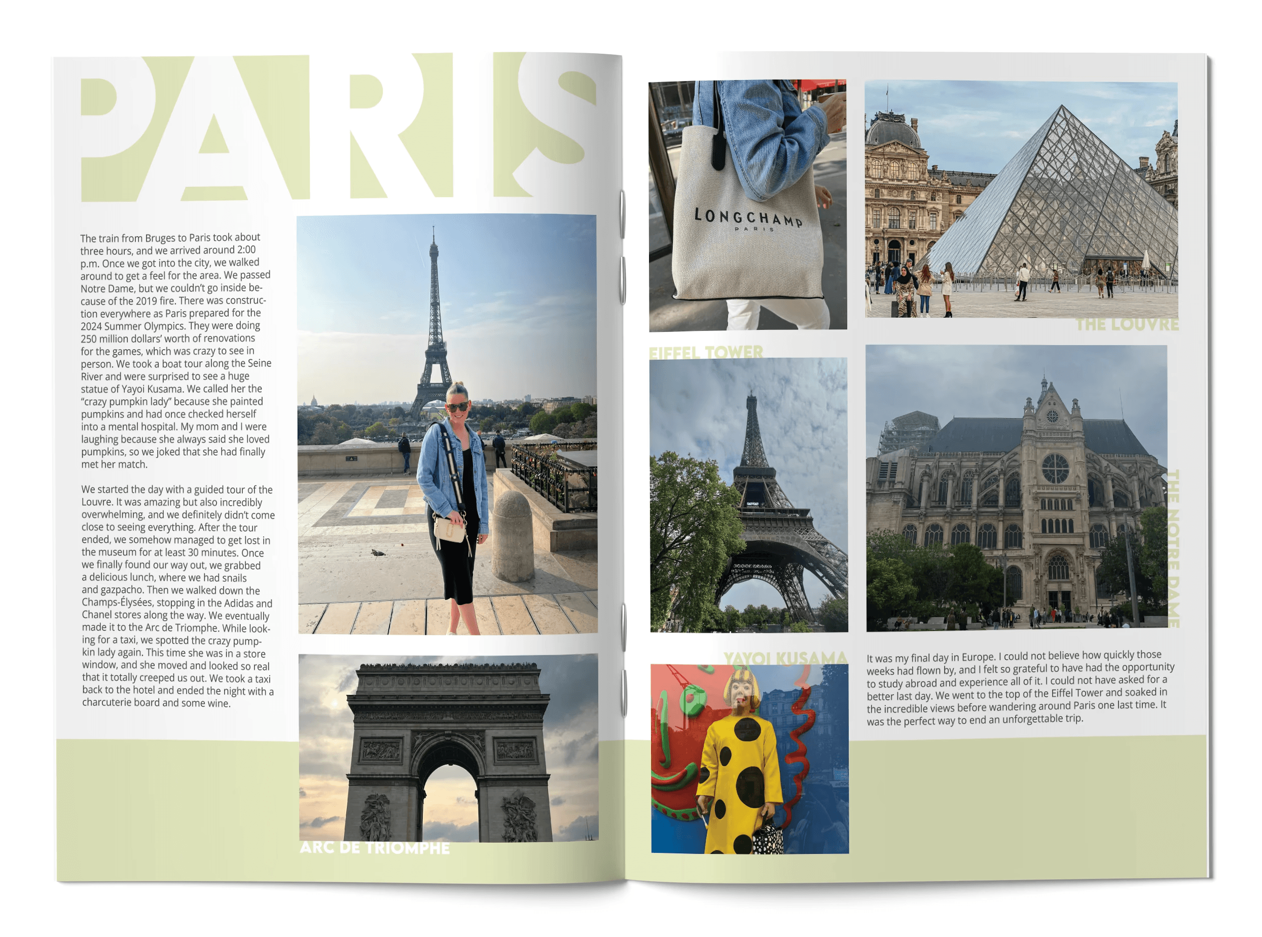 This project took me down memory lane and gave me the opportunity to revisit my time studying abroad in Florence. I had always wanted to turn the photos and moments I documented on Instagram into a physical scrapbook so I could have a tangible record of that experience. The process also served as a great refresher on InDesign, allowing me to experiment with editorial layouts and grid systems while bringing those memories to life in a thoughtfully designed book.