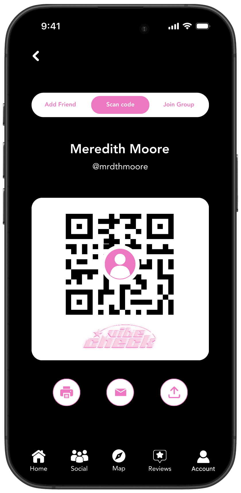 The QR code makes it effortless to expand your social circle on the app. Simply scan a friend’s unique QR code to instantly add them or join their group. Share your code with others to connect seamlessly, whether you're building a group for a night out or adding new friends to your network. It’s quick, convenient, and ensures you stay connected with the people you meet.