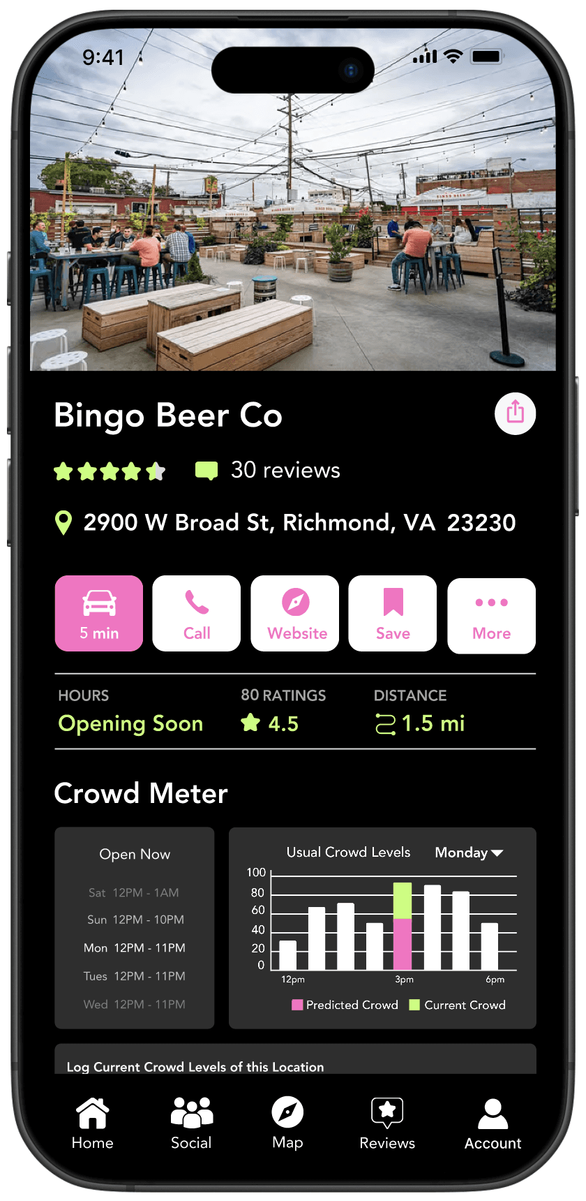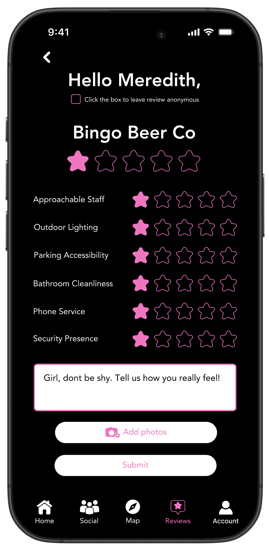 This feature helps you make informed decisions about where to go. Instantly see how crowded a bar is and share your own observations. Rate venues on key factors like staff approachability, outdoor lighting, parking accessibility, bathroom cleanliness, phone service, and security presence. You can also read reviews from others to get a clear picture of the venue’s vibe and safety, ensuring a fun and secure experience every time.