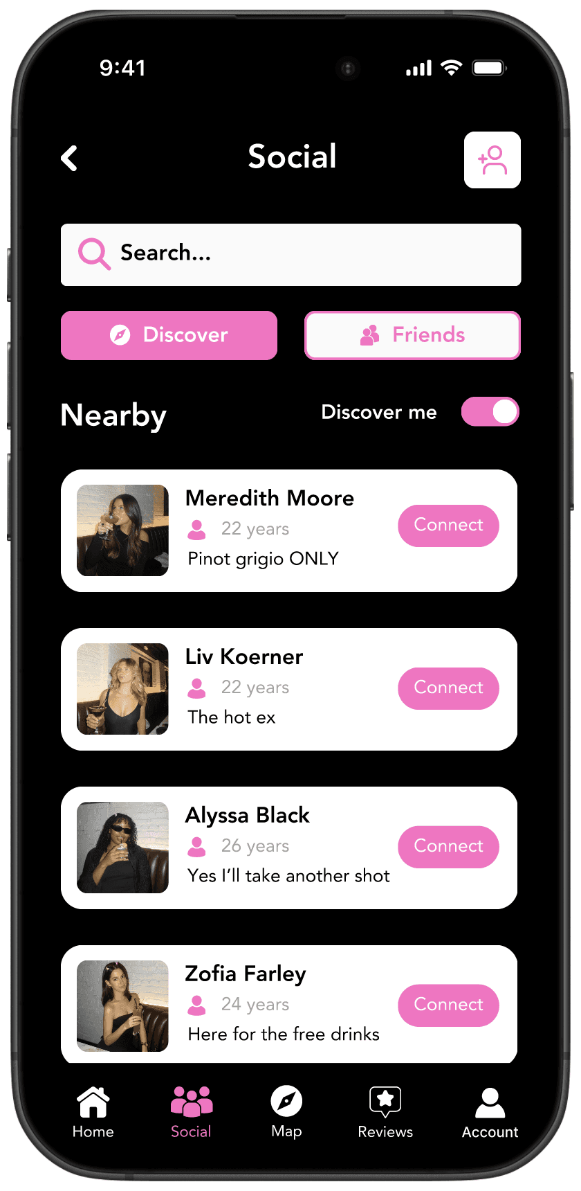 This feature enables users to discover and connect with people nearby in a social setting. Users can browse profiles that initiate connections. With the option to toggle their own visibility, users can choose whether they want to be discoverable or not, making it easy to engage with others on their own terms.