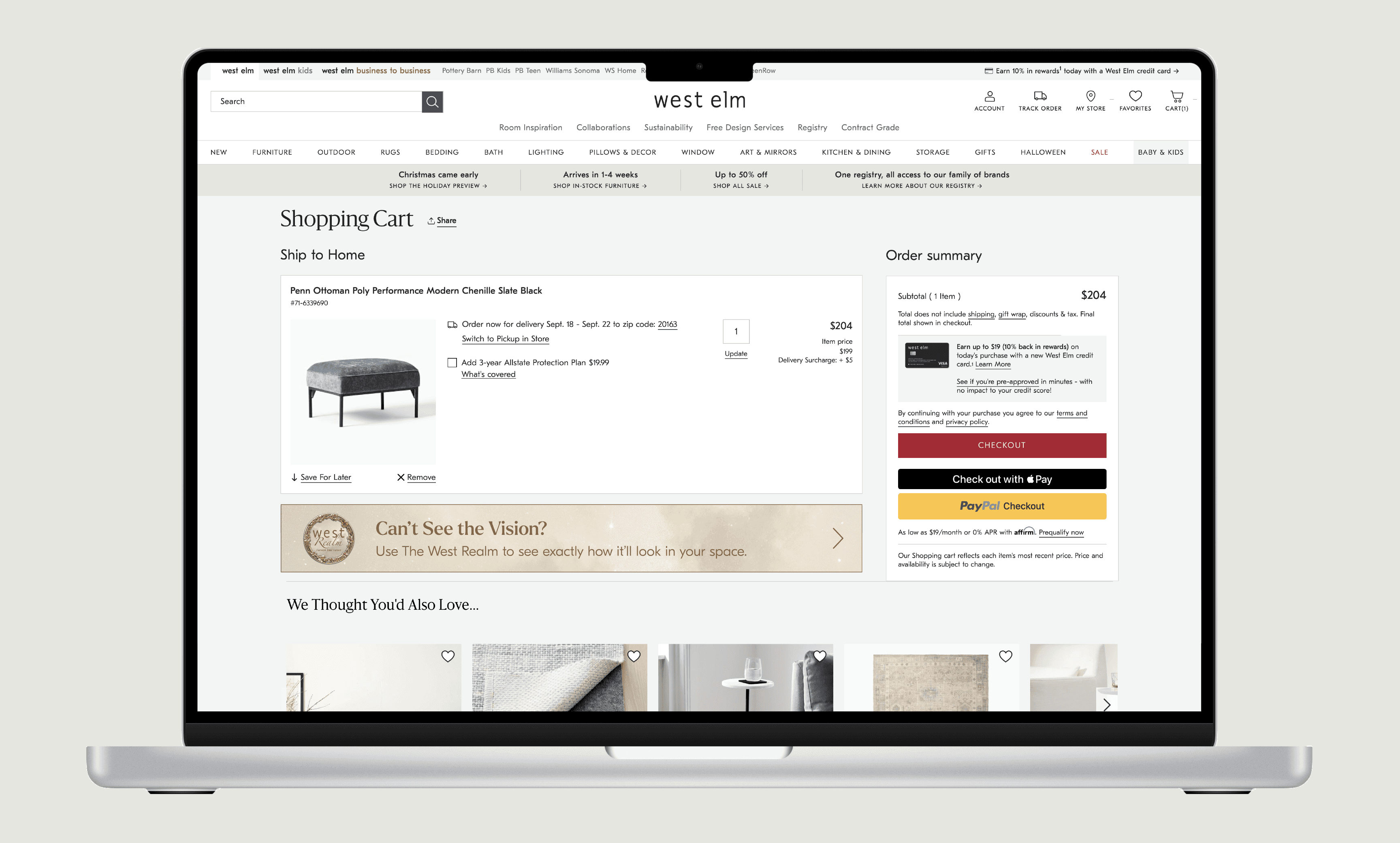 West Realm extends into the checkout experience through a subtle prompt on the shopping cart page. A reminder such as “Can’t see the vision? See it in your space” encourages users to visualize items before completing their purchase. Placed at the final stage of the journey, this moment allows users to validate their decision, reducing hesitation and helping prevent potential returns.