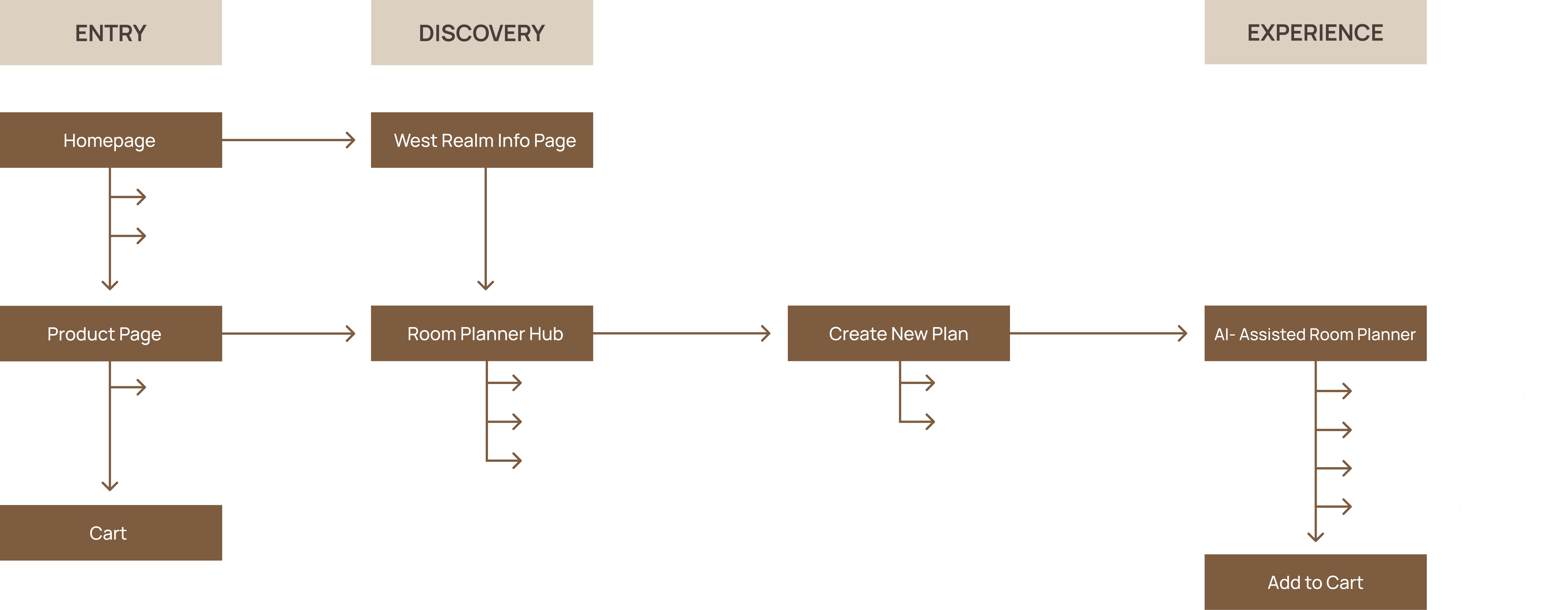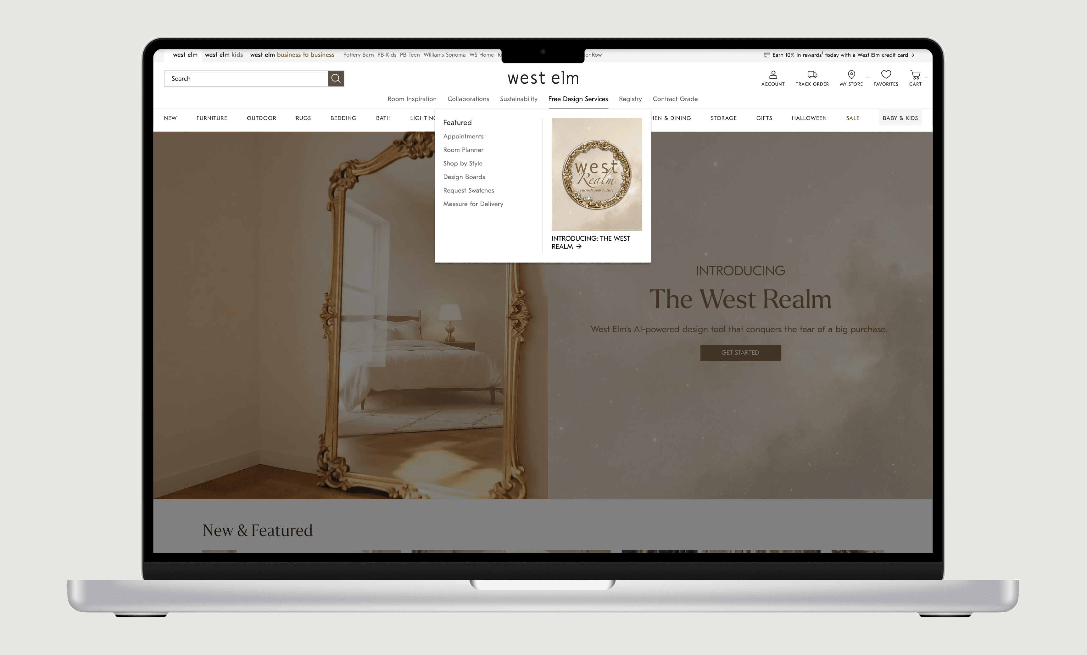 After the initial homepage promotion, West Realm transitions into a more integrated part of the experience. Rather than relying on a single entry point, it becomes accessible through existing navigation and discovery surfaces. Users can access West Realm through “Free Design Services” within the main navigation, where it lives inside the Room Planner, or by selecting “Introducing West Realm” as a featured entry point.